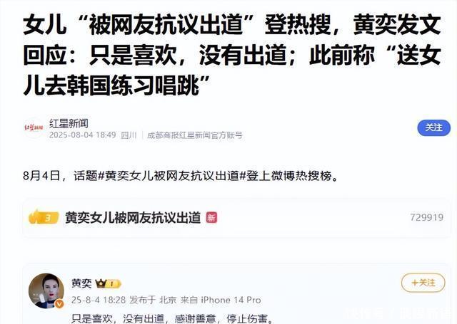 女儿“被网友抗议出道”登热搜,黄奕发文回应:只是喜欢,没有出道;此前称“送女儿去韩国练习唱跳”.红星新闻.2025-08-04