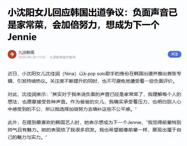 小沈阳女儿回应韩国出道争议:负面声音已是家常菜,会加倍努力,想成为下一个Jennie.九派新闻.2025-06-20